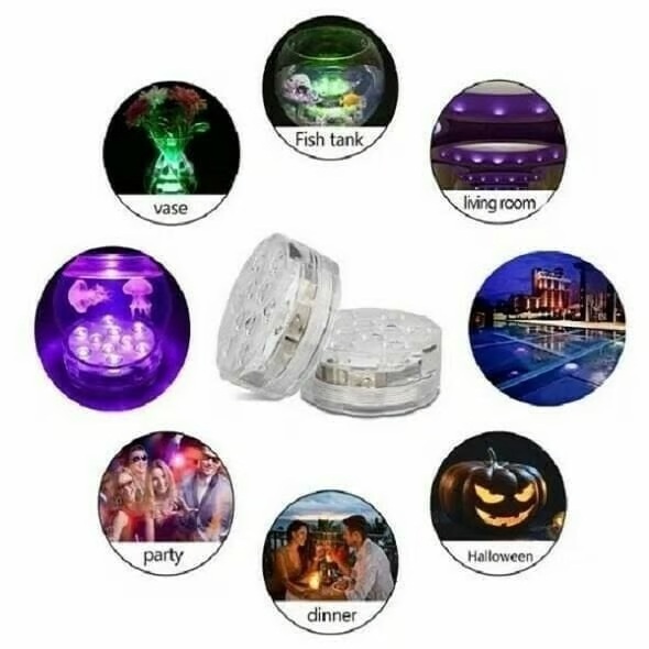 أضواء غاطسة مقاومة للماء بهيكل مقاوم للماء بالكامل، تعمل بشكل جيد في الأماكن الرطبة والجافة، مثل (إضاءة حمام السباحة، إضاءة البركة، القارب، أحواض السمك، المزهريات، أصيص الزهور، الشلال، أحواض الاستحمام، الجاكوزي، والممرات، حفلات الزفاف، إضاءة محيطة، أو إضاءة ليلية للديكور الداخلي والخارجي)