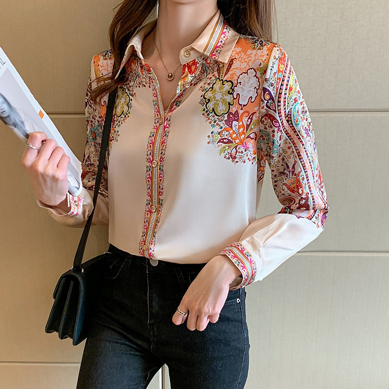 قميص نسائي من الساتان، بطبعة زهور